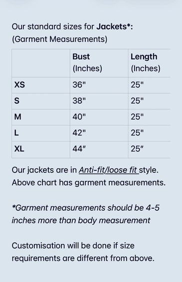 Our jackets are Loose fit (Anti fit or Off shoulder pattern) type. We mainly need chest size measurement.