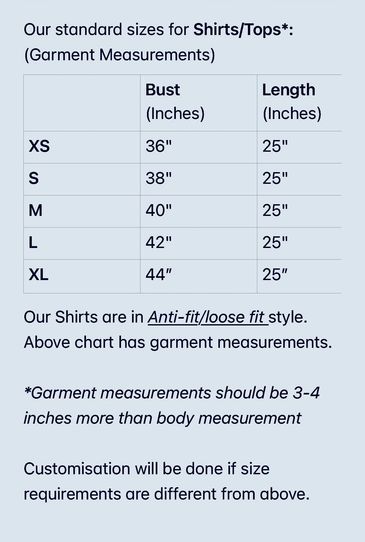 Please note that our size chart has Garment measurement not body size. These should be at least 2-3 inches more than body measurement. e.g. Our size M will be suitable for chest size 37-38 inches depending upon your comfort with loose