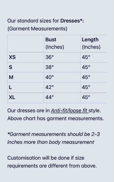 Please note that our size chart has Garment measurement not body size. These should be at least 2-3 inches more than body measurement. e.g. Our size M will be suitable for chest size 37-38 inches depending upon your comfort with loose fit dresses.